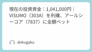 100万円投資 現在の投資資金:1,041,000円|VISUMO(303A)を利確、アールシーコア(7837)に全額ベット